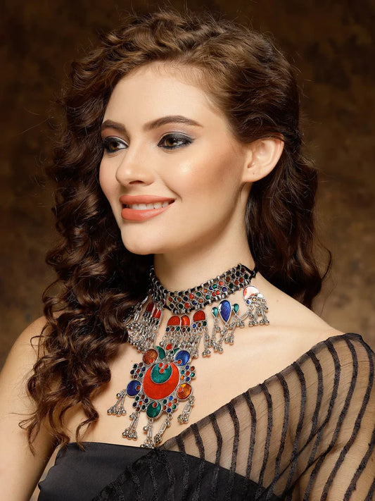 Meenakari Work Afghan Tribal Design Oxidised Silver Plated Handcrafted Necklace